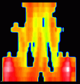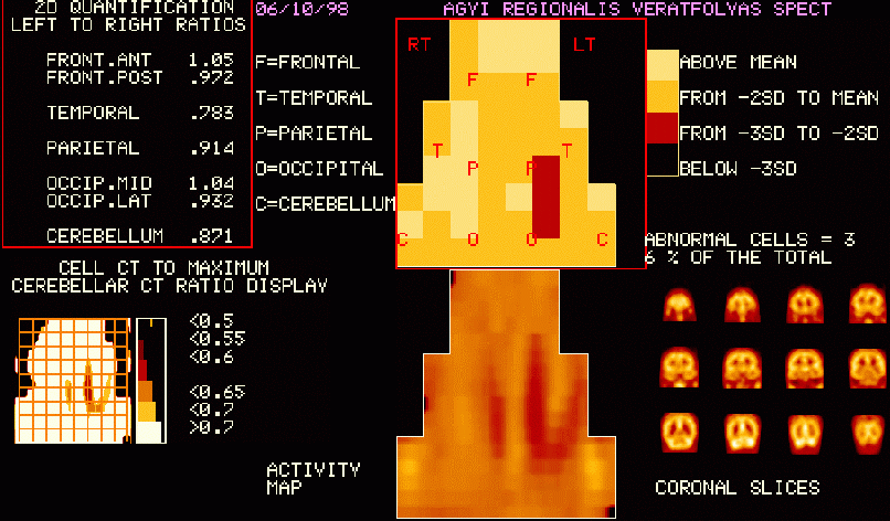A számítógépes feldolgozás részeként a [Tc-99m] HM PAO agyi vérátfolyás-vizsgálat coronalis metszeteiből (jobbra lenn) az agykéreg kb 1.5 cm vastag részének vérátfolyás-eloszlását az agyat körülvevő hengerpalástra vetítjük, majd kiterítjük (középen lenn). Így egyetlen képen áttekinthetjük az agykéreg részterületeinek vérátfolyás-eltéréseit.