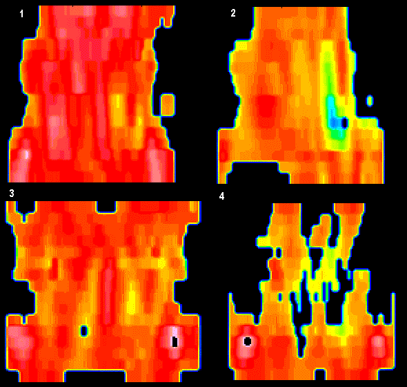 Az 1. képen bal oldalon még csak kis fokú, míg a 4. képen már mindkét féltekében globálisan és multifokálisan is kialakult súlyos vérátfolyás-zavar térképe látható a klinikailag demens betegnél: