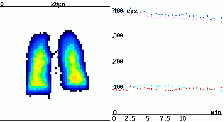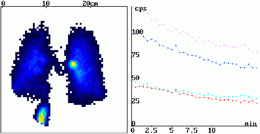 Balra a 32 db, egyenként 30 sec-os kép összeadásával kapott összegkép, jobbra a teljes tüdővetületből lassan kiürülő (tisztuló=clearance) radiofarmakon idő-aktivitás görbéi láthatók.