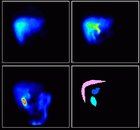 A jobb alsó képen a máj-parenchyma, a hilusi centrális epeutak és epehólyag vetületére illesztett ROI-k láthatók.