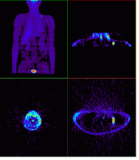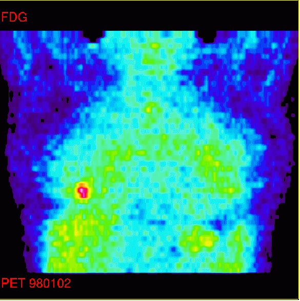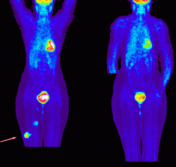 A 36 éves nőbeteg jobb combján Clark IV. stádiumú malignus melanoma volt. A műtét előtt távoli áttétek PET vizsgálattal történő kimutatása volt a cél. A primer tumor (nyíl) intenzív FDG halmozása mellett a jobb combtőben és inquinalis régióban észlelhető kóros FDG halmozás. Egyéb helyen áttét nem észlelhető:
