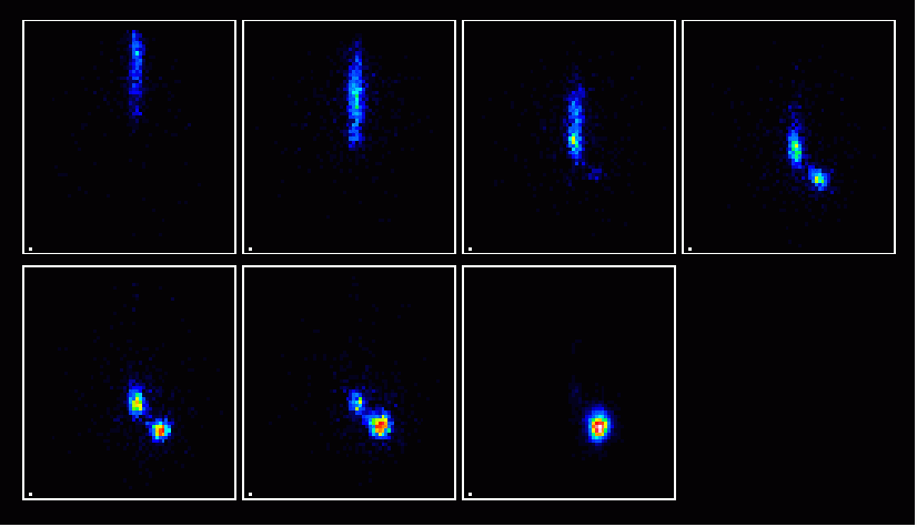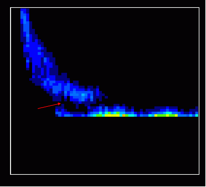 A lenyelt folyadék-bólus lefelé történő haladását egymás mellé rakott függőleges, 1 sec széles képcsíkokkal megjelenítő parametrikus képen jól látható, hogy a nyelet először gyorsan, majd egyre lassulva halad a nyelőcsövön, és részletekben jut át a cardián ( nyíl) a gyomorba.