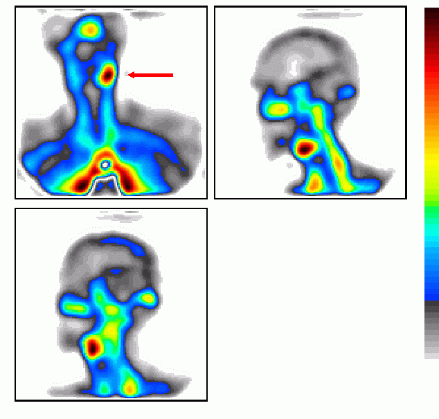 A nagyobb vértartalmu terimék (nyíl) jól ábrázolódnak. A bal submandibuláris regióban kialakult puha, fájdalmatlan terime lehajláskor megnagyobbodott. A műtéttel igazolt aneurisma vértartalma a testhelyzettől függően változik.